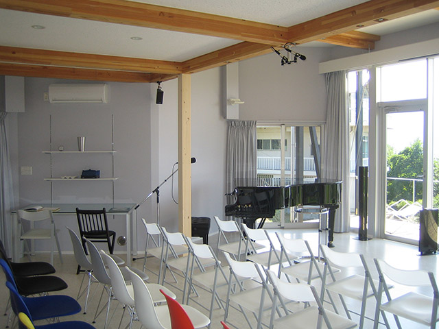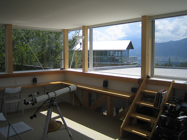 敷地は山の裾野の傾斜した丘陵地であり、西側正面に鳳凰三山を主とする南アルプス連山、北に八ヶ岳、南に富士山を望む開けた土地である。周辺には畑や田んぼ、住宅地が点在する。この家は、東京に住むオーナーの週末の家として計画されている。屋根と1F床は、傾斜する敷地と対比的に水平な板状の形とし軽く浮かぶ。屏風形の壁は冬の季節風に対して建物に強度をもたせるためと、楽器を演奏する音の響きによい形であり、水平な板状の屋根を持ち上げるように立つ。