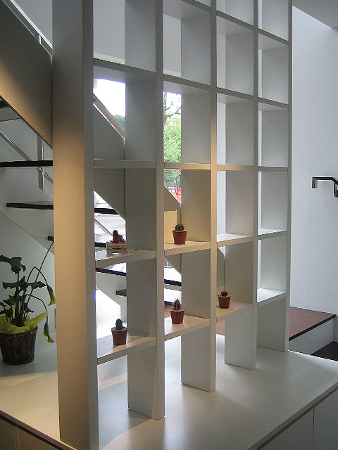 敷地に沿ってビオトープをもつ遊歩道があり、付近には公園もある恵まれた敷地である。三角形の敷地になじむ形として建物はL形となった。外観もL型のマッスを積み木のように組み上げた形である。庭に面した開口部から周囲の恵まれた景観を取り込んでいる。