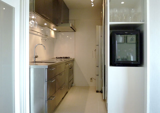 築30年の分譲マンションの改装事例である。夫婦のための住宅であることと、それぞれの仕事場+住宅をつくるという計画である。改装前の間取りは3LDKであり、家族の住む住居としては典型的なものである。それを住み手に合わせ、1LDKのSoho(Small+home/office)的な間取りへと変更した。唯一の個室は防音が施されたピアノ室となり仕事場を兼ねる。LDKのスペースは間仕切りをなくしワンルームとし、その一角を家具で仕切ることでもう一つのコンパクトな仕事スペースを設けた。キッチンも、多少住宅的な仕様から離れる形で業務用に近いステンレスキッチンとして改修された。 |