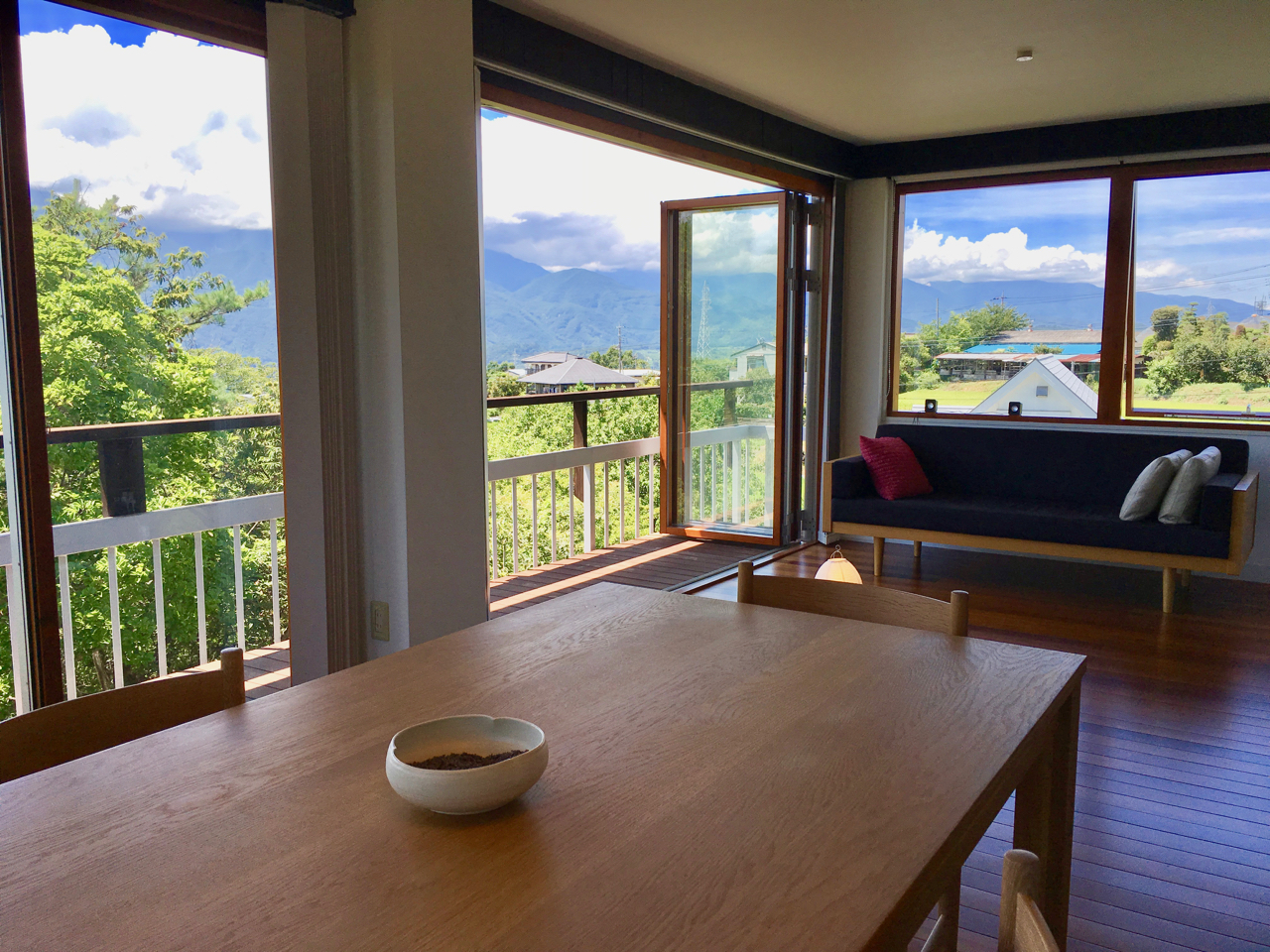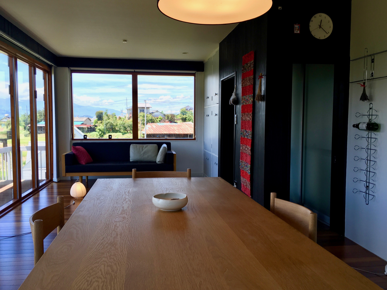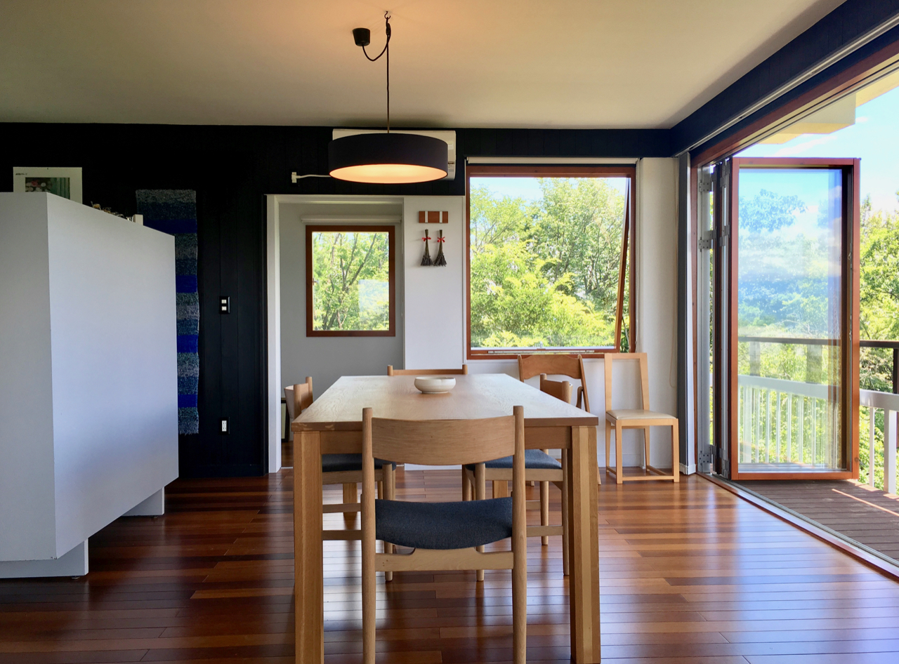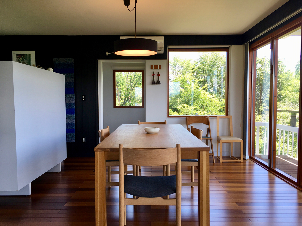 この計画は築45年の住宅のリフォームである。この家は当初別荘として建てられ、その後住宅となっていたが、家主の高齢化により不在となっていた。敷地は南アルプス連山や富士山、八ヶ岳など望めるとても良いところであり、主体構造の鉄筋コンクリート躯体も問題ないので、建物を生かしリフォームすることとなった。リフォーム計画のメインの内容は、使いにくい階段の位置を変更することであり、それ以外に間取りは変わっていない。改善項目としては、二階の居間の老朽化したアルミサッシュを木建具へと変更した事である。変更によって、居間の熱環境の改善を行うと共に、中間期にはフルオープンに出来る事で、豊かな自然を取り込めることとなった。居間の壁は木板張りであるが、経年変化で痛んでいたので、黒いステインで塗装した。結果白い壁との対比が内装のアクセントとなった。 |
